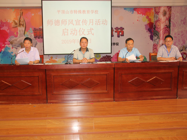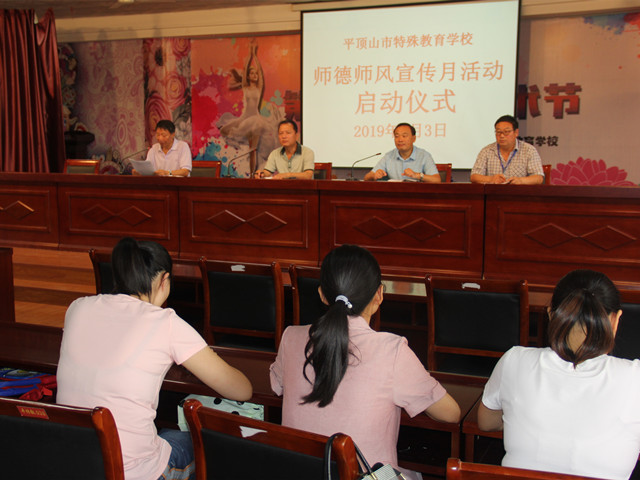 在副校长丁光辉的领誓下,全体教职工起立,攥紧并举起右拳,庄严宣誓,洪亮的教师誓词在大会议室中回荡。接着丁校长宣读了《平顶山市特殊教育学校师德师风倡议书》,提倡志存高远,关爱学生,严谨笃学,自尊自律,扬师德,强师能,铸师魂,做学生健康成长的指导者和引路人。副校长石春山带领全体教师重温了《新时代中小学教师职业行为十项准则》和《新时代幼儿园教师职业行为十项准则》。校长林亚南指出,今年的师德师风活动月正好迎来了第35个教师节,尤其是恰逢建国七十周年举国同庆的大环境中,特别强调要营造良好氛围,扎实开展系列活动,把近两年学校涌现出来的省、市级优秀教师、河南最美教师、鹰城最美教师、平顶山市师德标兵共七名同志的先进事迹,有特色地宣传出来,用身边人的先进事迹感染大家,为推动工作,提升特教质量,提供不竭动力。