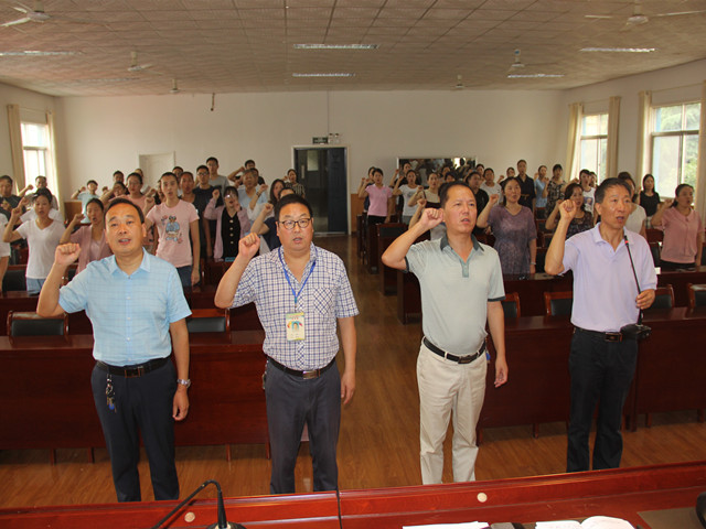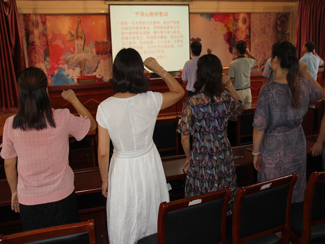 “我是一名光荣的人民教师,我庄严宣誓:忠诚党的教育事业,贯彻国家教育方针,恪守教师职业道德,履行教书育人职责……”9月3日下午,我校新学期“平顶山教师誓词”宣誓仪式在学校四楼会议室隆重举行,学校全体教职工参加了宣誓仪式。