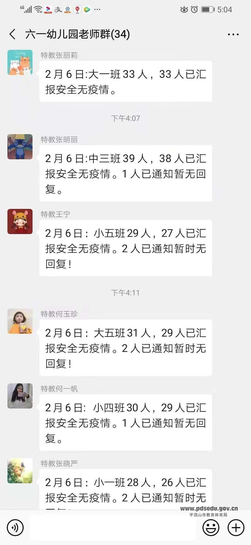 该校六一幼儿园利用工作群,全面排查教职工、幼儿及家长近期有无去过武汉、信阳、南阳等地,有无从武汉、信阳、南阳等地返回,有无与武汉、信阳、南阳等地返回人员接触史等情况,同时对教职工、幼儿及家长的身体状况逐一进行排查上报。坚持日报告和零报告制度,要求所有教职工和幼儿家长,对疫情防控异常情况随时上报。