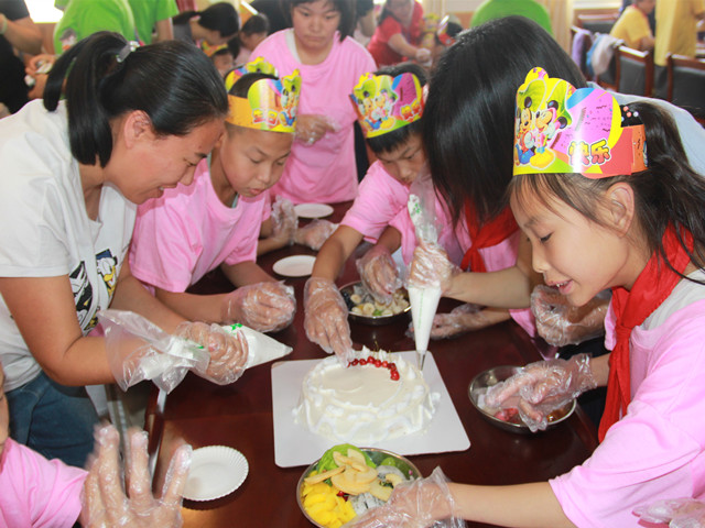 活动开始,聋生们在班主任的带领下有秩序的佩戴好衣服、手套及帽子,在专业糕点师傅的指点下,聋生们兴奋的动起手来,抹奶油、裱花、用水果和巧克力来点缀,忙的不亦乐乎。当然在旁边的班主任和科任老师们也帮忙递材料、有的在旁边用手机记录着孩子们最美的一刻。聋生们尽情发挥着自己的想象,尝试着做出自己心中漂亮的蛋糕,不一会,带着无尽创意的蛋糕就都完成了,大家高兴的手舞足蹈。整个活动在轻松、愉悦的环境中进行着,老师们和志愿者们都乐在其中,当聋生们吃到自己亲手做的蛋糕时,他们脸上溢满甜蜜的笑容。