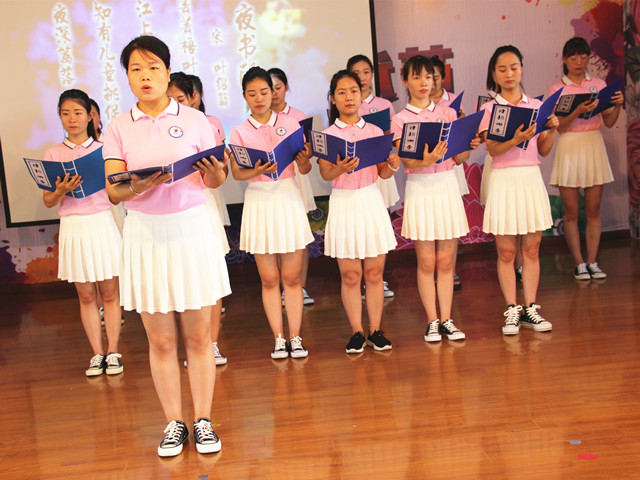 在第三届道德讲堂主持人雷伟、梁慧平的主持下,全体起立,同唱《爱的奉献》,“只要人人都付出一点爱,世界将变成美好的人间”。在经典诵读诵读环节,年轻女教师同诵《诗韵四季》,气势恢宏。二十八名富有青春活力的年轻女教师,身穿粉色T恤、洁白短裙,在六一幼儿园陈亚楠和李乐乐两位副园长的领诵下,让老师们走进唐宋诗人描摹的一首首四季经典诗歌中,领略到了诗歌文化的魅力。