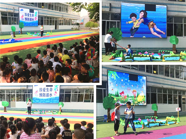 活动中,大班老师为幼儿们创设了丰富的情景,并组织幼儿一同观看了防溺水安全教育片,教孩子们掌握防溺水的自我保护知识。使大家形象、直观的了解到在河边玩水的危害,了解生活中防溺水注意事项:如不独自到池塘边、河边或田间水沟嬉戏;不独自或和同伴去河边游泳;当发生同伴溺水危险事故时应及时向附近的大人求救,不得自行组织救助,等防溺水的正确方法。