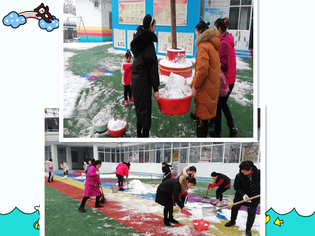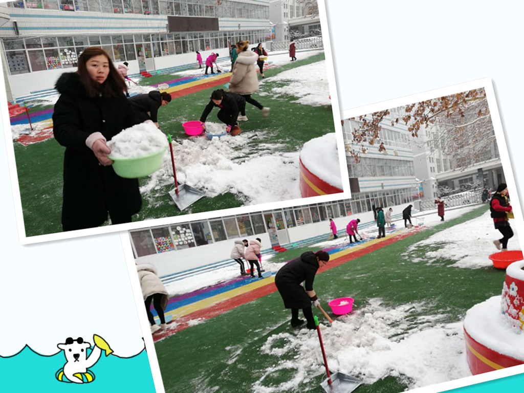 为了快速顺利的完成这次行动,老师们分工协作,各年级划分扫雪区域。赵园长亲自领兵“出征”,大家手持铁锹、扫帚等除雪工具,积极地投入到扫雪除冰的战斗中。雪带着寒意,风吹的刺骨,但在校园扫雪的老师们鼻子上都冒着细细的汗珠,脸上洋溢着微笑。不论男女老少,大家都干的热火朝天,因为有爱不惧风寒。