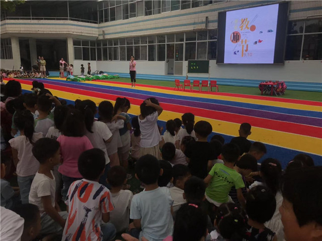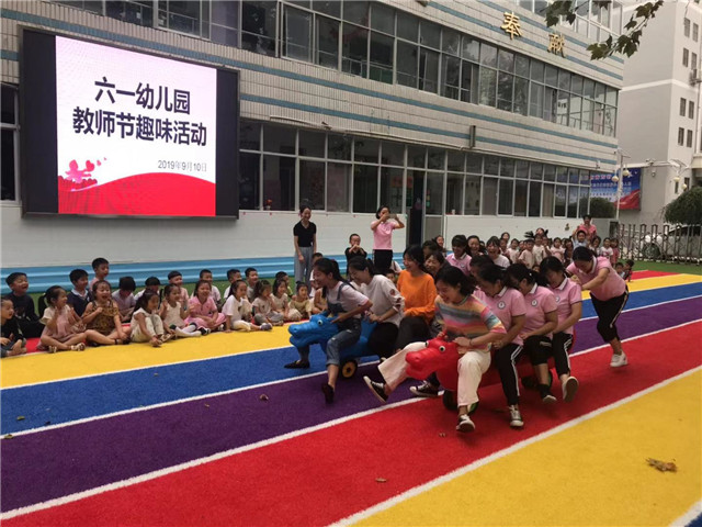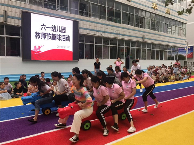 本次系列活动包含两项内容:第一项内容是感谢师恩。首先是老师利用电子大屏向孩子们介绍教师节的来历和意义,最后孩子们为了表达师恩纷纷向老师们献花,感谢老师的辛苦付出和精心培育。第二项活动是教师们的趣味活动“划船比赛”。六一幼儿园全体教师热火朝天的参与到趣味活动中,大家的脸上都洋溢着幸福的笑容,仿佛回到了自己无忧无虑的童年时光,此次活动也让老师们体会到教师节的甜蜜氛围。